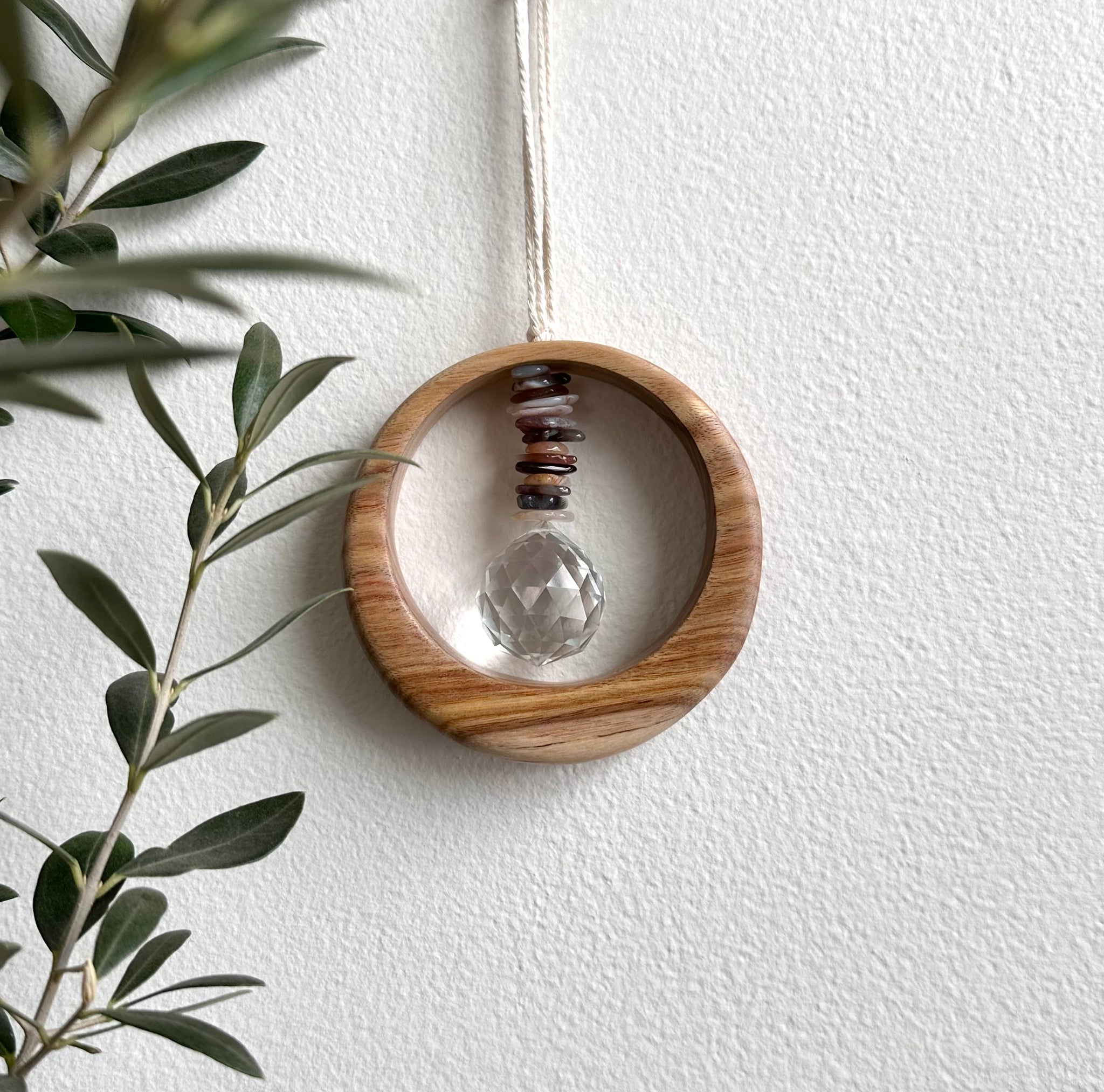 Hand cut and finished Canarywood with Botswana Agate stones and a rainbow making prism. Each suncatcher is handmade, unique and one of a kind. Place in direct sunlight and enjoy your rainbows.