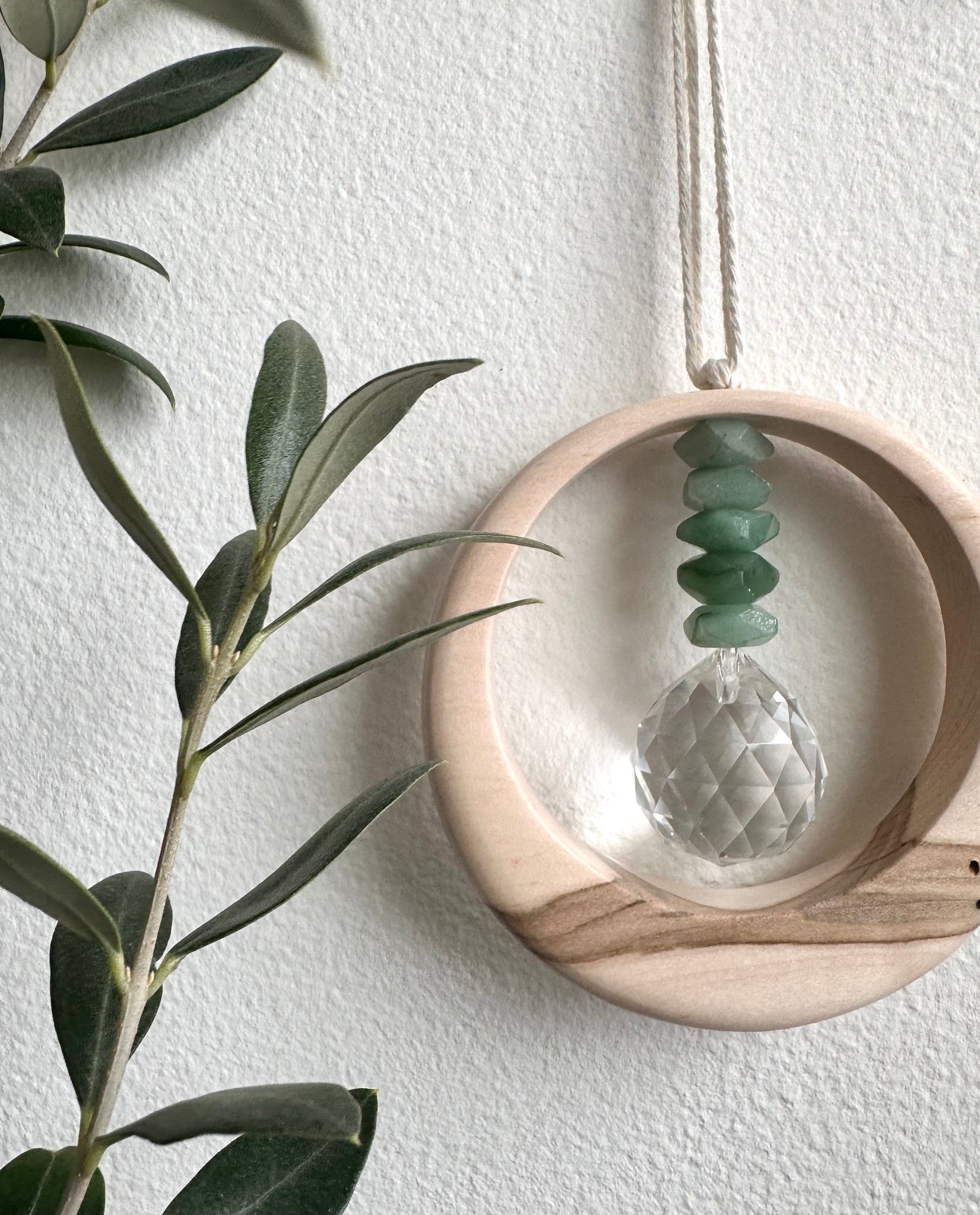 Hand cut and finished Maplewood with Green Aventurine gemstones and a rainbow making crystal prism. Each suncatcher is unique, handmade and one of a kind. Place in direct sunlight and enjoy your rainbows. I truly hope this piece brings you such good energy and joy!