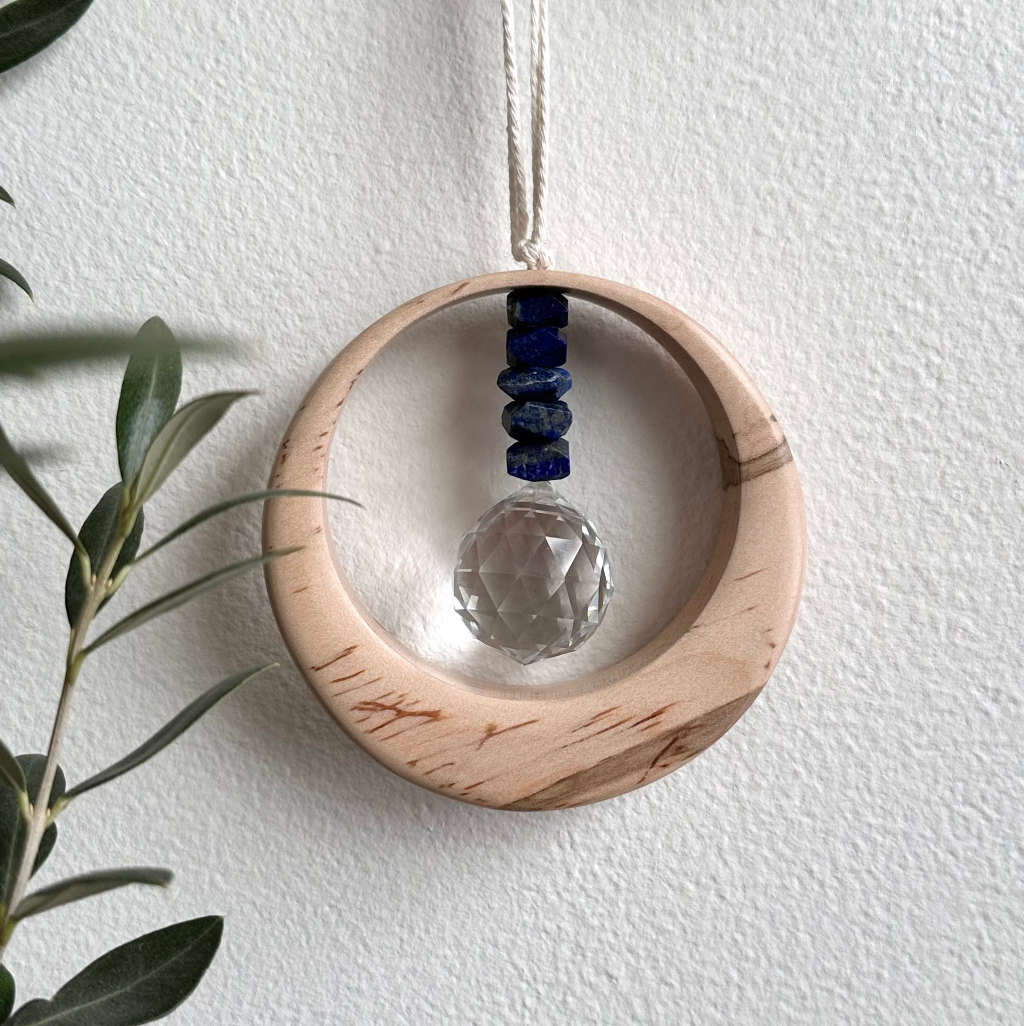 Hand cut and finished Maplewood with Lapis Lazuli gemstones and a rainbow making prism. Each suncatcher is unique, handmade and one of a kind. Hang in a sunny spot and enjoy your rainbows. I hope you enjoy them and they bring you good energy and joy!