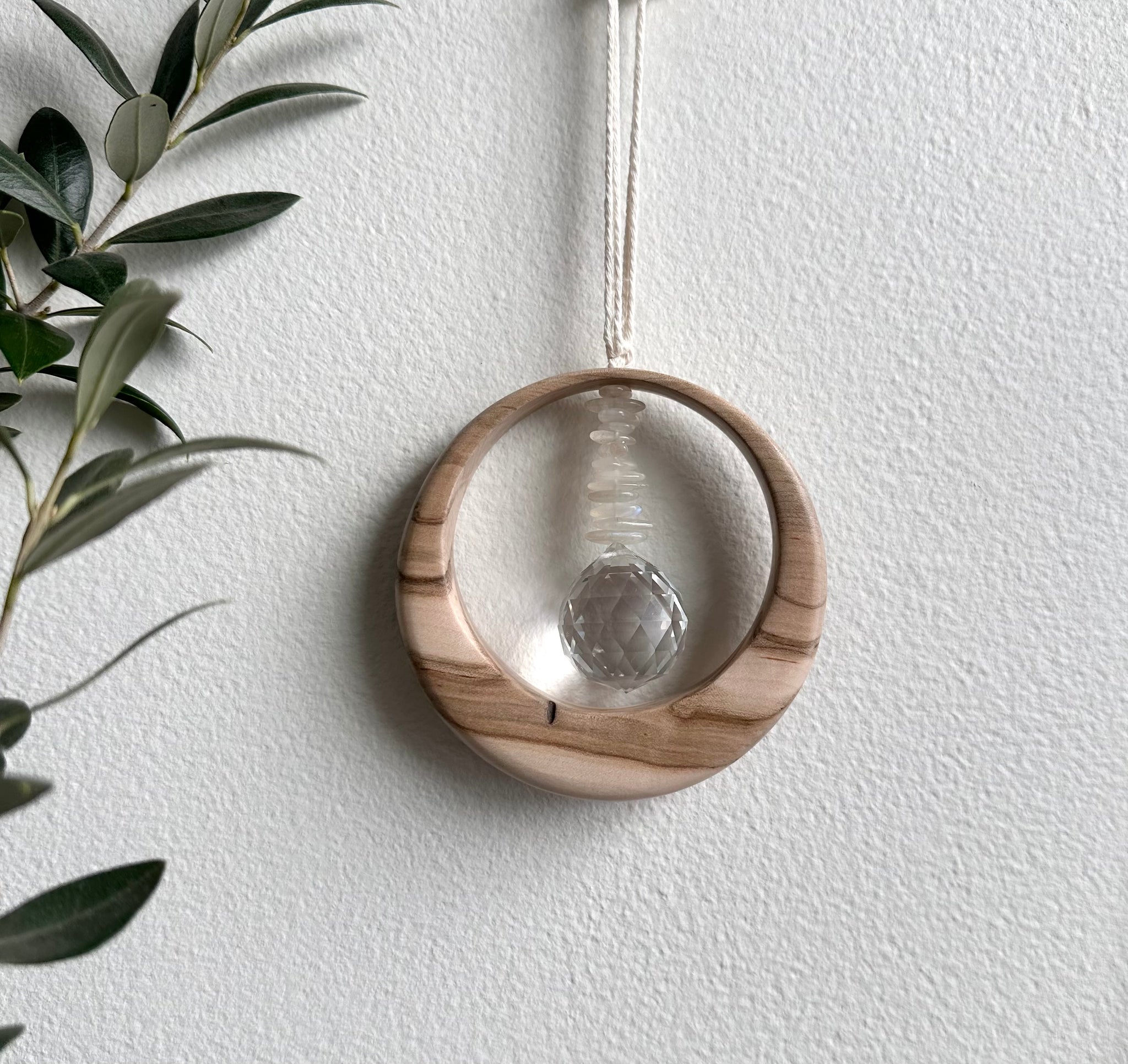 Hand cut and finished Canarywood with moonstone and a rainbow making prism. Each suncatcher is handmade, unique, and one of a kind. Place in direct sunlight and enjoy your rainbows.