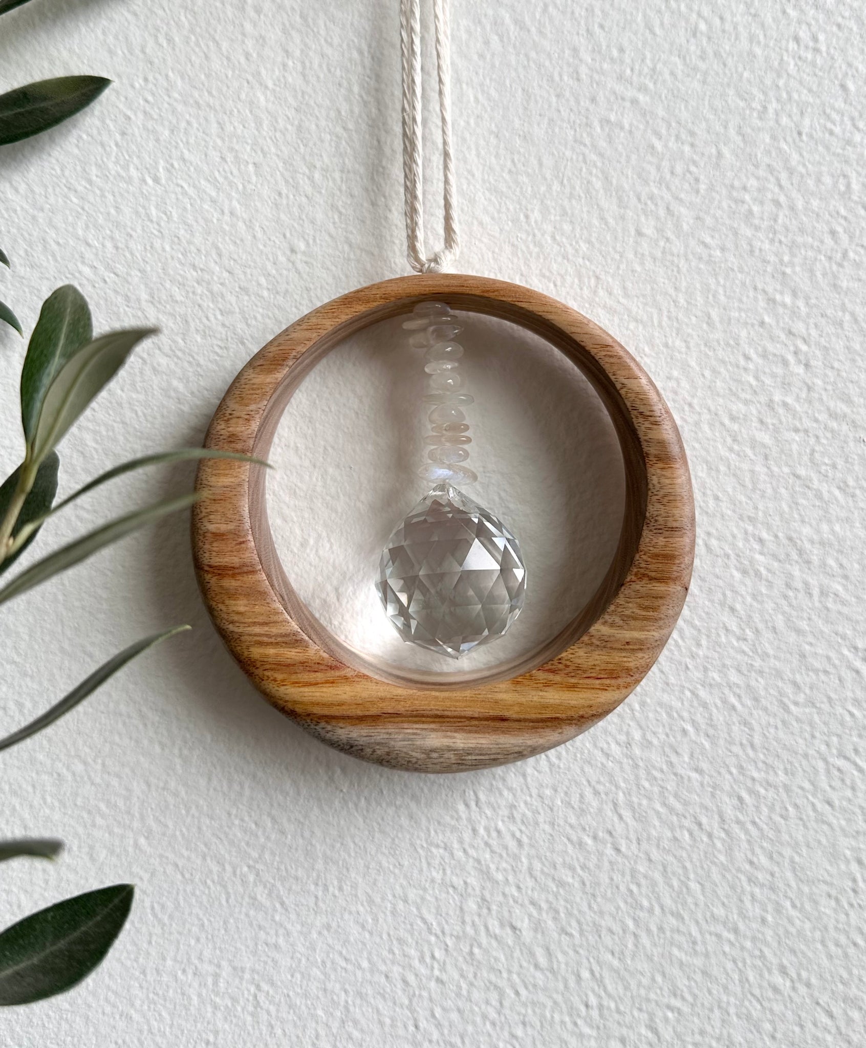 Hand cut and finished Canarywood with moonstone and a rainbow making prism. Each suncatcher is handmade, unique, and one of a kind. Place in direct sunlight and enjoy your rainbows.